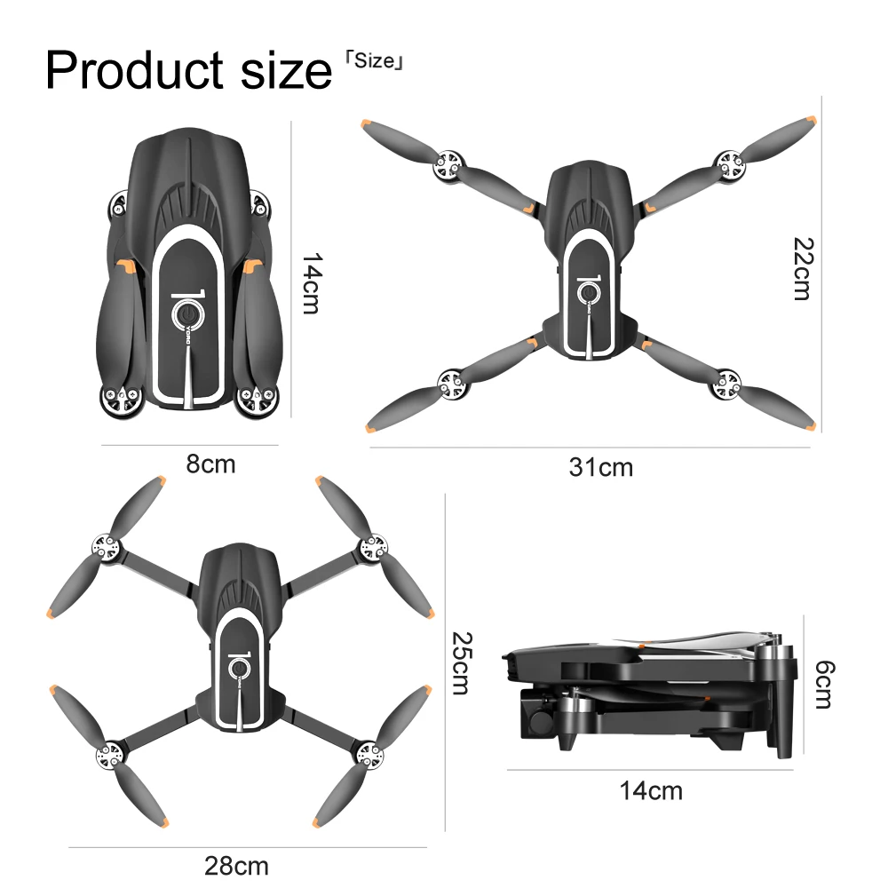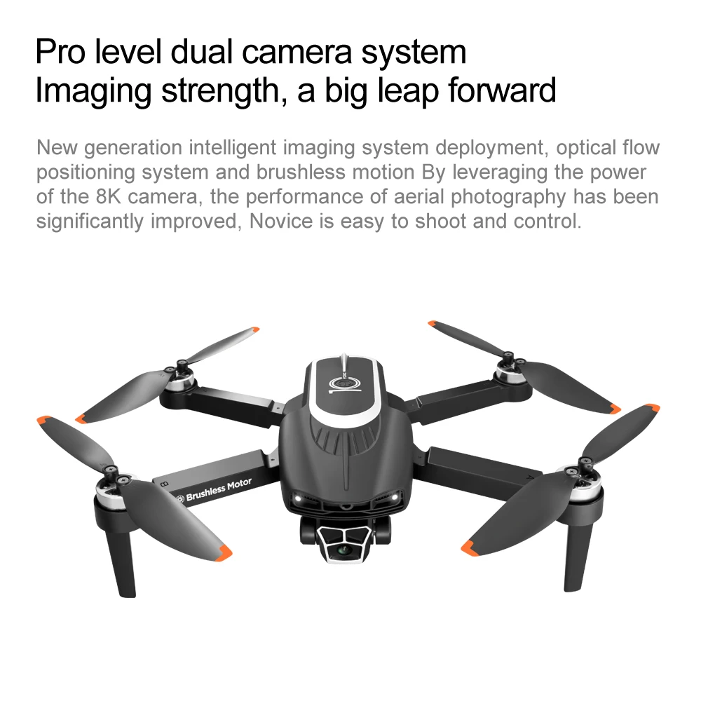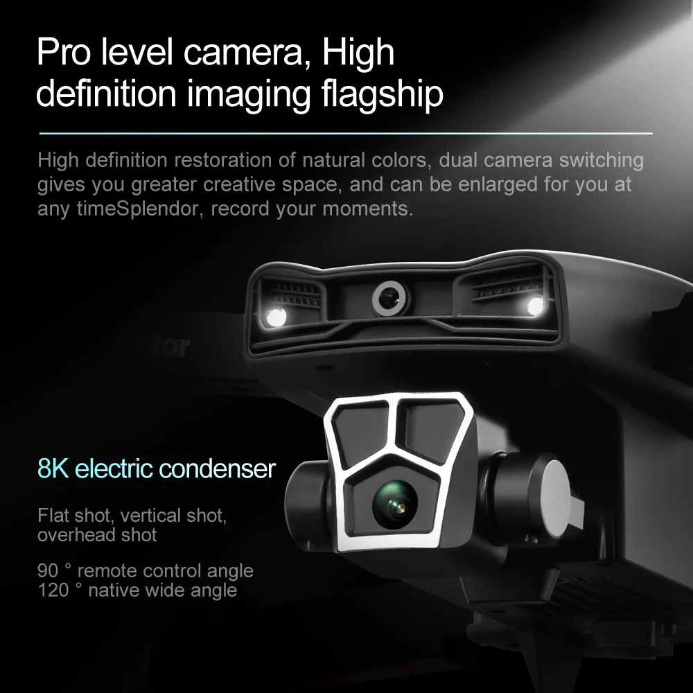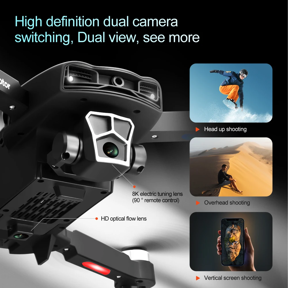 1. The front lens is placed with wide-angle 8K high definition WIFI, the bottom high definition lens with optical flow can switch the camera angle, the steering gear gimbal is designed to increase stability, and EIS electronic anti-shake is added to make the photo line clearer (support horizontal shooting, vertical shooting, overhead shooting)