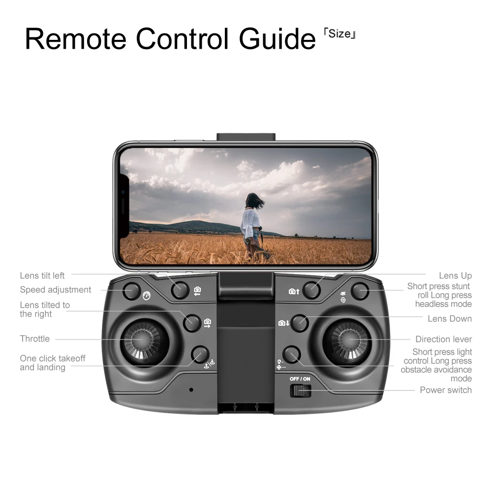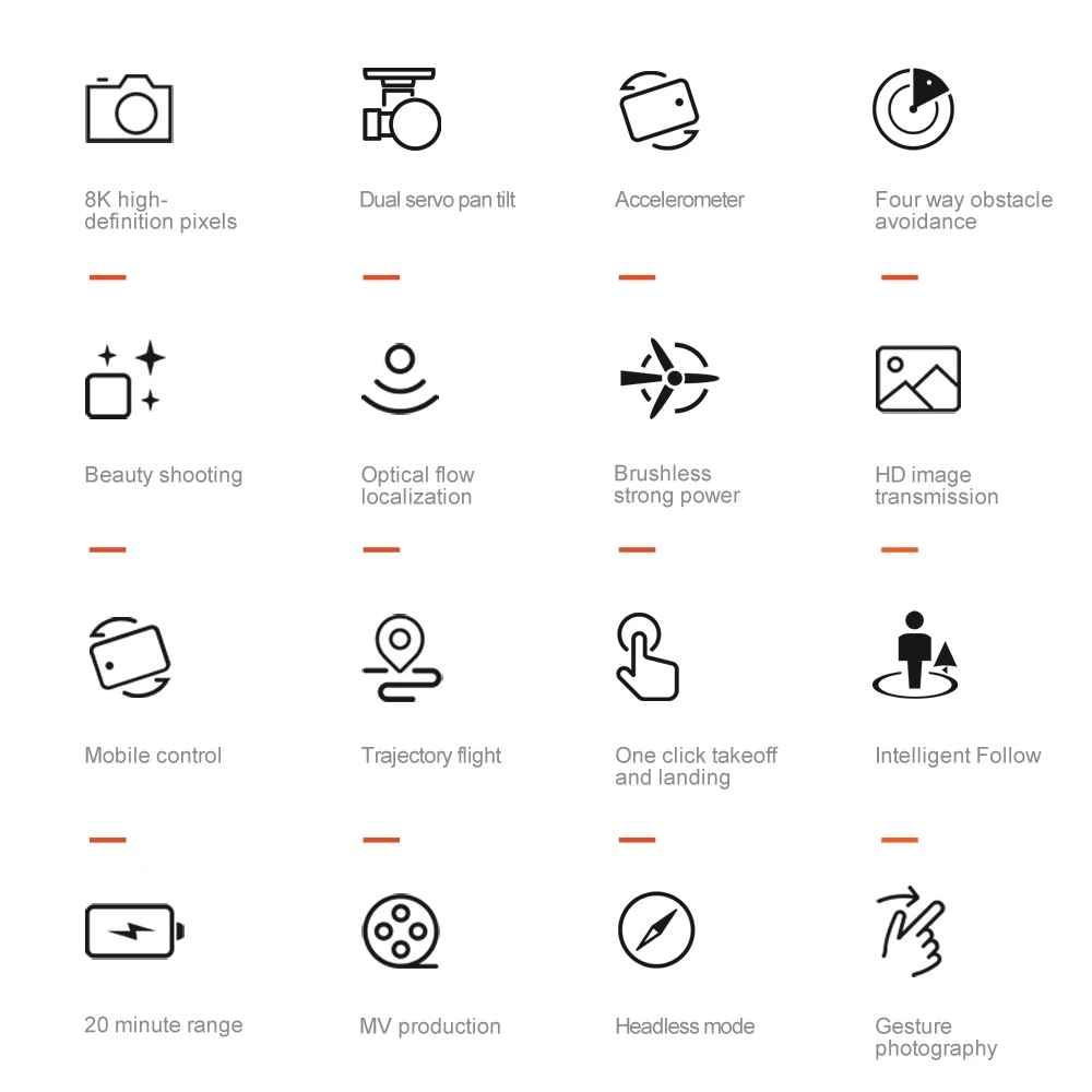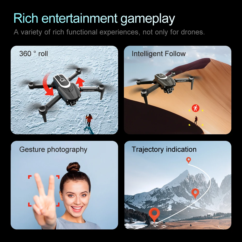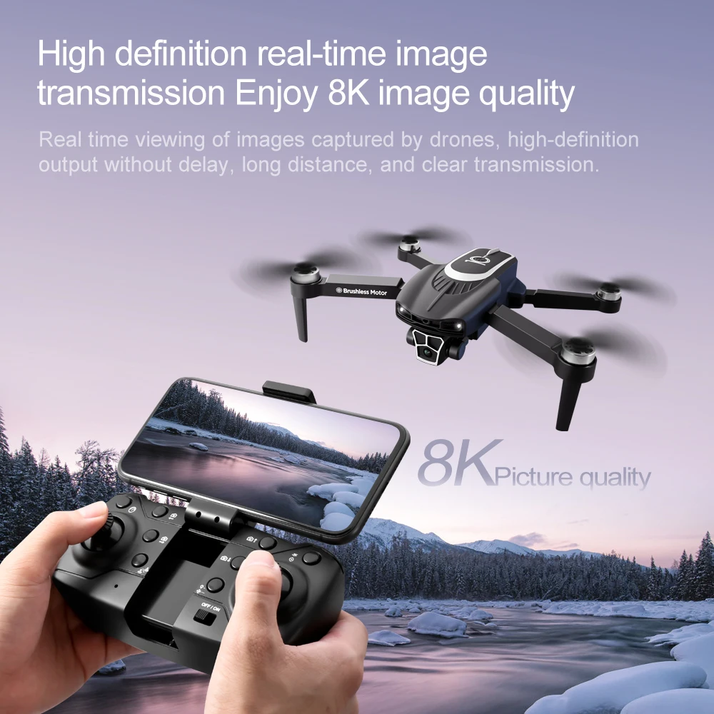 1. The front lens is placed with wide-angle 8K high definition WIFI, the bottom high definition lens with optical flow can switch the camera angle, the steering gear gimbal is designed to increase stability, and EIS electronic anti-shake is added to make the photo line clearer (support horizontal shooting, vertical shooting, overhead shooting)