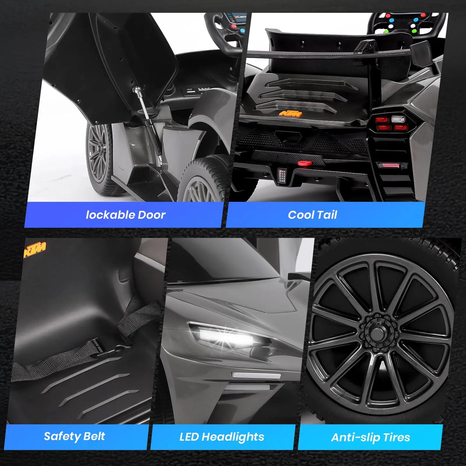 Secure and Safe Design: The KTM 12V electric sports car features a secure locking door and safety belt to ensure your child's safety. With a gentle start for smooth acceleration, LED lights for driving during evening playtime, it's designed for young drivers and passengers alike. Max load: 30kg.