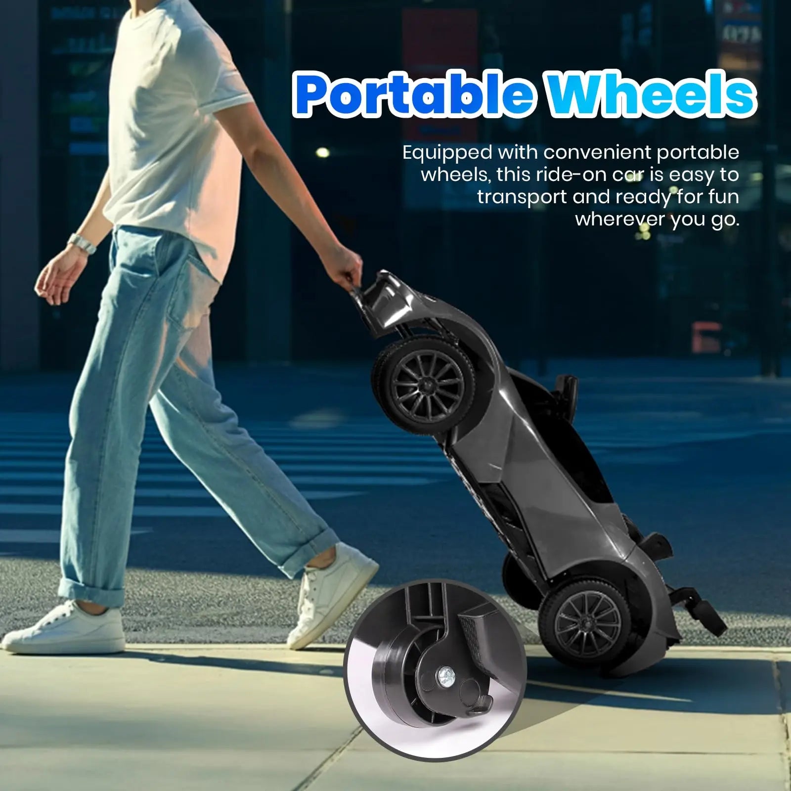 Fun and Convenience: Enhance the ride with the built-in music player that supports Bluetooth connectivity. Designed with convenient portable wheels, this ride-on car is effortlessly movable, making it ready for fun adventures wherever you go.